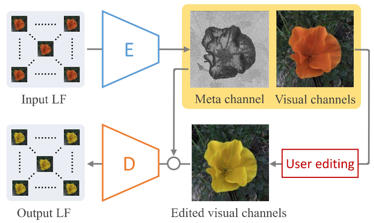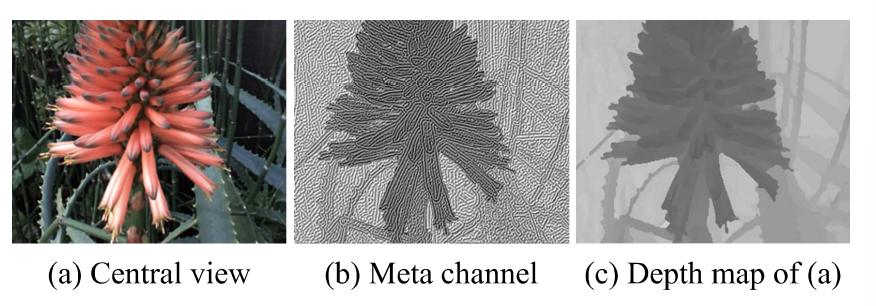 在没有限制元通道的视觉形态的情况下,为什么它长得这么像一个灰度图?和一个RGB图(视觉通道),这实现了4D光场数据的压缩,另一方面,针对视觉通道的编辑可以通过和元通道的结合重建光场,并一致性地传播到新的光场之中。