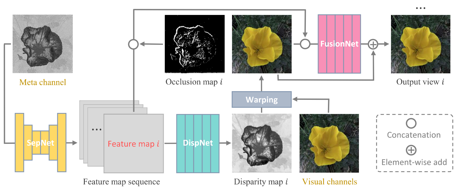 $SepNet$:该网络的作用是特征分离,具体地说,这个模块将元通道 $Z$ 分解为一系列特征映射 $\{F_i\}$,其中每个 $F_i$ 包含视图 $i$ 的特征信息,和视觉通道独立,可以和视觉通道结合重建视图 $i$。